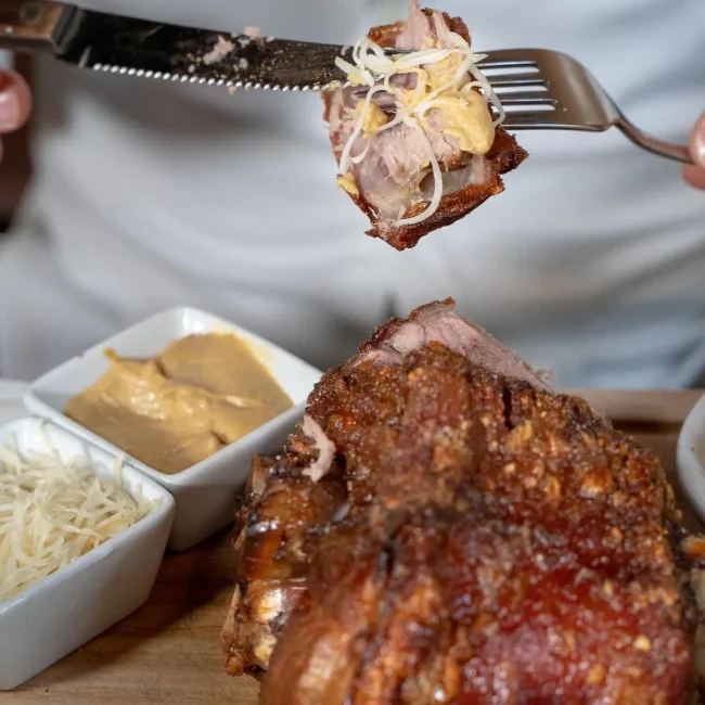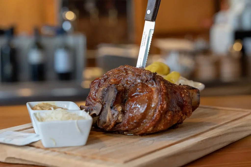 Eine weitere Spezialität unserer Familie ist die knusprige Stelze. Diese wird in unserem Hause klassisch mit Krautsalat, Ölpfefferoni, Senf, Hausbrot und frisch gerissenem Kren serviert.